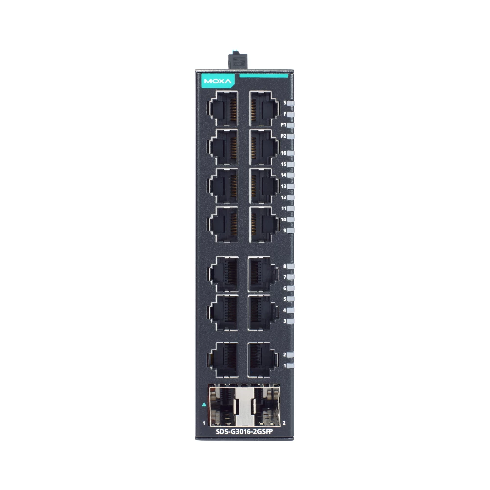 Moxa’s SDS-G3016 Series is a compact, full-Gigabit Layer 2 smart switch built for modern automation cabinets and Industry 4.0 networks. Choose 16 copper ports or 14 copper plus 2 SFP on the 2GSFP models to mix high-throughput machine cells with long-reach fibre uplinks without sacrificing panel space. A robust metal, IP40 enclosure measures just 36 x 135 x 111 mm, making these switches ideal where space is at a premium.