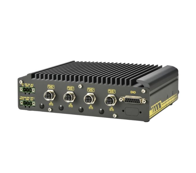 Neousys Intel Atom x6425E In-Vehicle Fanless Computer: 4x M12 Gigabit PoE Ports, 3x USB, up to 4x COM Port.