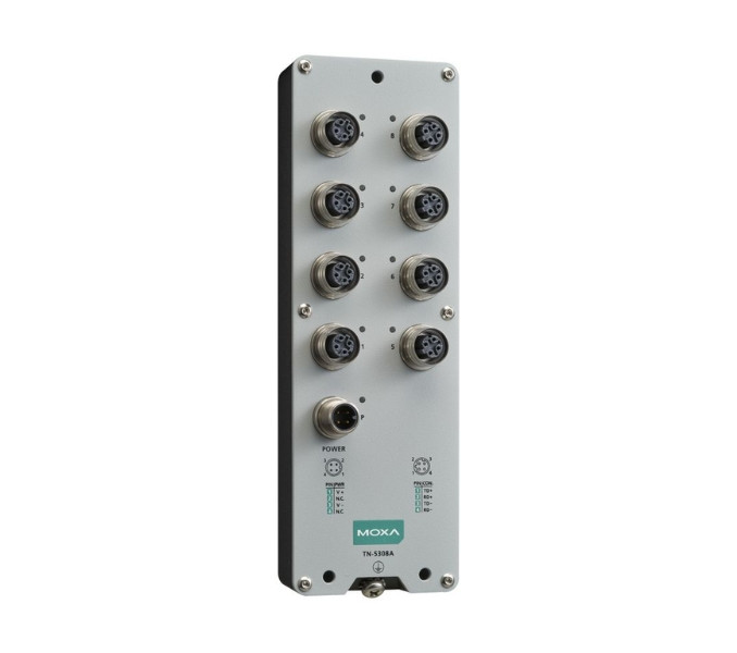 8 Port EN50155 Unmanaged Ethernet Switch with 8x M12 D-coded 10/100BaseT(x) PoE+ ports.
